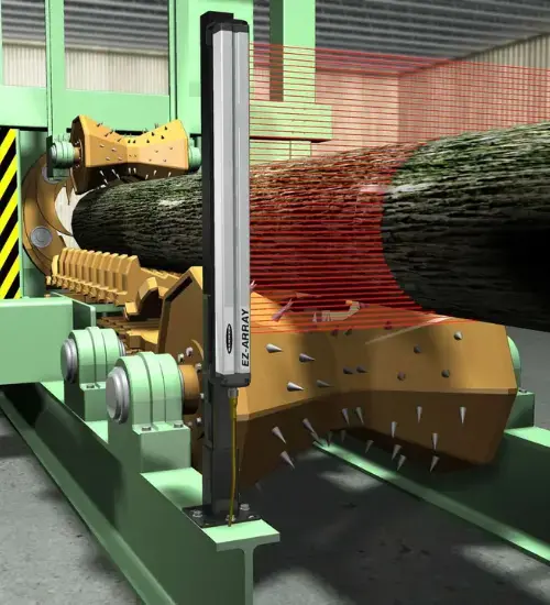 Inaccurate log detection and positioning in debarking, edging, trimming, and cutting operations causes material waste, blade damage, production stops, and safety hazards.