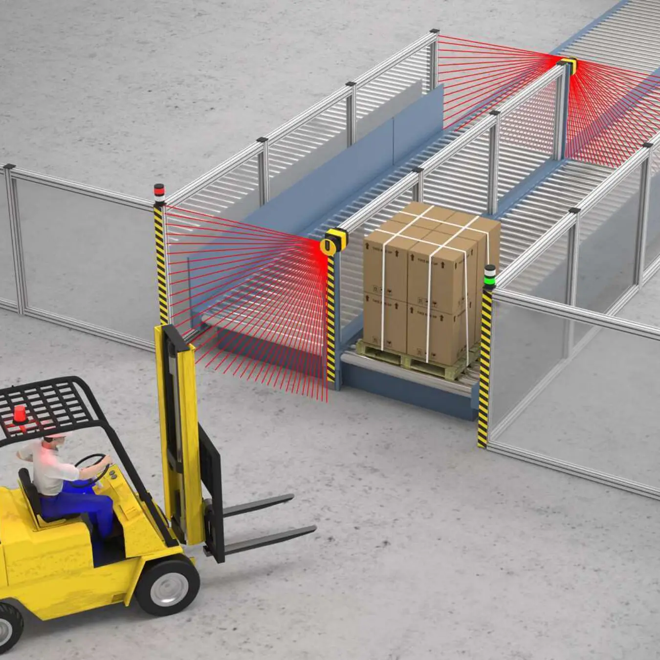 Palešu konveijeri rada riskus tieši ielādes un izlādes punktos. SX5 skeneri uzrauga piekļuvi bez fiziskiem šķēršļiem, skenējot vairākus ieejas punktus un pat grīdas līmeni. Kad operators tuvojas, konveijers automātiski apstājas.