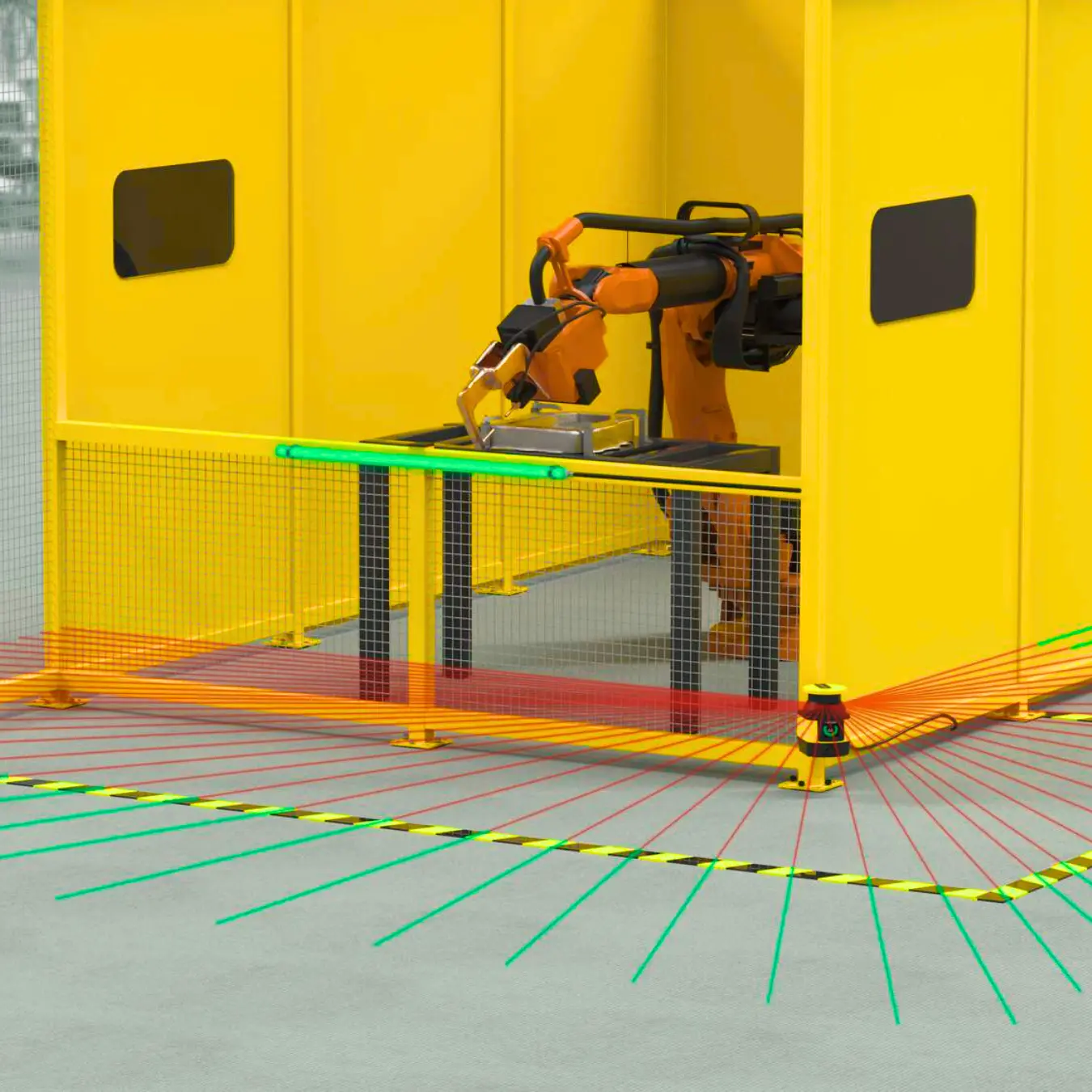 Metināšanas šūnās tradicionālie metāla nožogojumi bieži ir nepietiekami, jo materiāli jāievieto un jāizņem manuāli. SX5 skeneris rada divas zonas – brīdinājuma zonu un drošības zonu. Ja darbinieks tuvojas, brīdinājuma zona ieslēdz vizuālu signālu, piemēram, LED indikāciju. Ja ieiet drošības zonā, robota darbība tiek nekavējoties apturēta. Tādējādi darbinieki vienmēr saņem skaidru brīdinājumu pirms bīstamās zonas.
